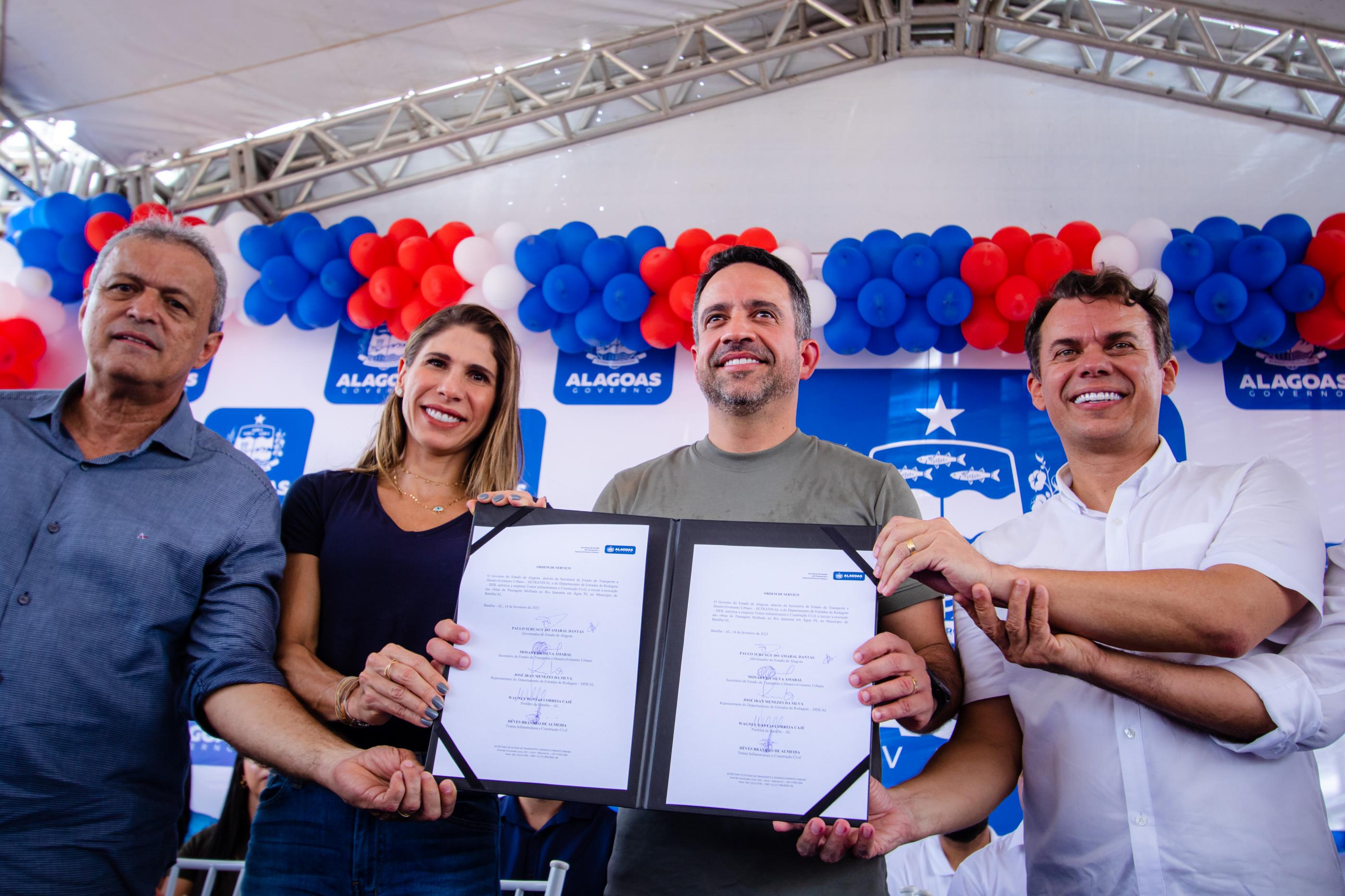 Durante a assinatura da Ordem de Serviço para o início das obras de passagens molhadas em povoados de Batalha, na manhã desta terça-feira (14), o governador Paulo Dantas anunciou a realização de mais duas obras do programa Alagoas de Ponta a Ponta, que vão beneficiar o município e cidades vizinhas.