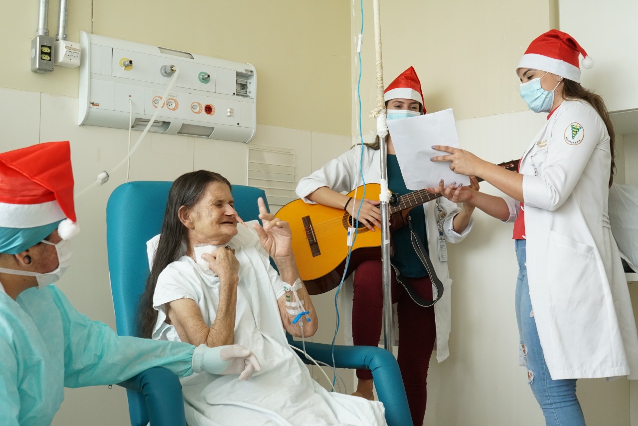 O resultado do estado de saúde da paciente merecia uma comemoração especial. Para isso, a equipe multiprofissional organizou uma ação natalina com voz e violão. “Essa ideia surgiu durante o tratamento dela. Combinamos que, se melhorasse, ela cantaria com a gente neste fim de ano. A iniciativa deu uma meta para ela atingir”, explicou a residente em fisioterapia, Renata Moreira.